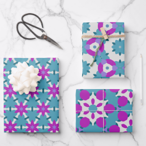 Design 2: This bright and dynamic pattern features interlocking floral and geometric shapes in shades of teal, purple, and white. The floral motifs are woven together in a rhythmic, kaleidoscopic design, creating a lively, eye-catching effect. Perfect for paper crafts, gift wrapping, and home decor projects, this pattern brings a modern, yet whimsical touch to any project. The combination of cool and warm tones makes it versatile and suitable for various creative uses, appealing to designers and DIYers alike.