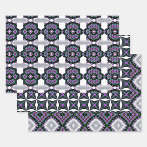 2. Intricate pattern of diamonds and squares in shades of purple, grey, white, black, and green. The background is a solid color with a seamless texture that adds depth to the overall composition.