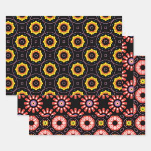 vivid wrapping paper, floral gift wrap, abstract patterns, mandala-inspired wrapping paper, geometric gift wrap, colorful gift wrap set, modern black wrapping paper, bold gift wrap designs, creative wrapping paper, decorative gift wrap ideas.