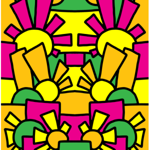 –> View all with this design Bright, geometric shapes in yellow, pink, and green create a symmetrical pattern. The repeating motifs resemble stylized suns and rectangles arranged in a mirrored composition. Colorful, simple line art drawing of an abstract pattern with suns and geometric shapes in pink, purple, green, yellow, and black on a white … Read more